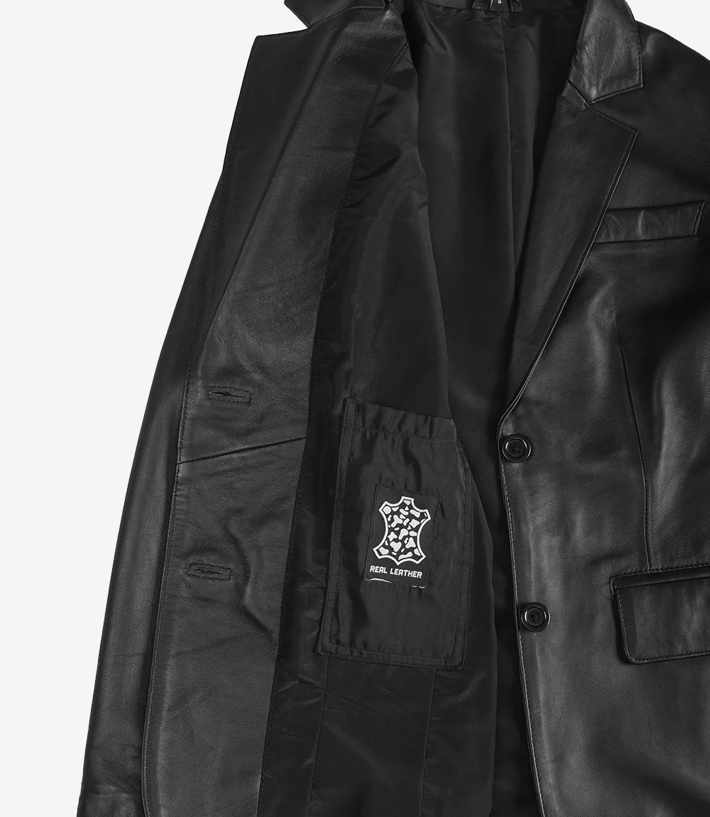 Step into elegance with our Two Button Notch Lapel Black Leather Blazer Jacket for women. Crafted meticulously from premium leather, it promises to be a timeless addition to your wardrobe. The notch lapel adds a touch of classic sophistication, while the two-button closure ensures a tailored fit. Pair it with formal trousers or a chic skirt for a versatile look that transitions effortlessly from day to night. Elevate your style quotient with this iconic piece that epitomizes grace and modernity.